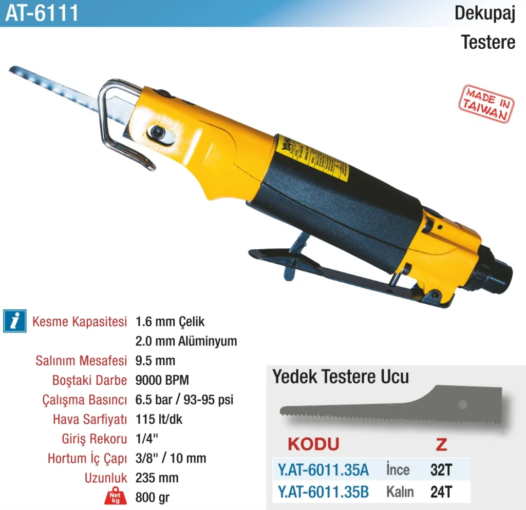 Havalı Dekupaj Testere, ince ve hassas kesimler gerektiren işlerde profesyonel kullanım için geliştirilmiştir. Pnömatik sistemi sayesinde titreşimsiz, güçlü ve sessiz çalışır. Metal, plastik ve ahşap gibi farklı yüzeylerde yüksek performans sunar.
