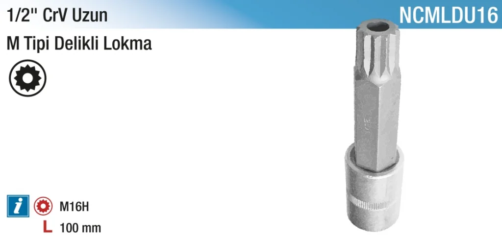 NT 1/2" 16 mm CR-V M Tipi Delikli Uzun Lokma, derin ve dar alanlarda kullanılan M tipi somun ve vidaların söküm/takım işlemleri için tasarlanmış özel bir lokmadır. Uzun gövdesi sayesinde ulaşılması zor bölgelerde kolay çalışma imkanı sunar. Krom Vanadyum çelikten (CR-V) üretilmiş olan bu lokma, dayanıklılık ve performans açısından üst düzeydedir. 1/2” tahrik sistemine uyumlu olup güçlü lokma kolları ile beraber profesyonel mekanik işlerde rahatlıkla kullanılır. Sanayi ve tamirhane ortamları için idealdir.