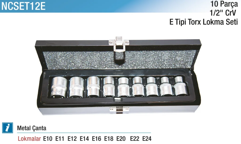 10 Parça 1/2" CR-V E Tipi Torx Lokma Seti, otomotiv, mekanik ve sanayi sektörlerinde sıkça kullanılan E tipi bağlantı elemanlarıyla çalışmak için ideal bir settir. Dış Torx lokmalar, yüksek kaliteli Krom Vanadyum çelikten üretilerek uzun ömürlü ve darbe dayanımlı hale getirilmiştir. 1/2” tahrik sistemine uyumlu olması, güçlü lokma kolları ve darbelere dayanıklı el aletleri ile birlikte kullanım olanağı sunar. Set, E4’ten E24’e kadar farklı boyutları kapsar ve profesyonel kullanıcıların tüm ihtiyaçlarına yanıt verir. Pratik saklama kutusu ile düzenli kullanım sağlar.