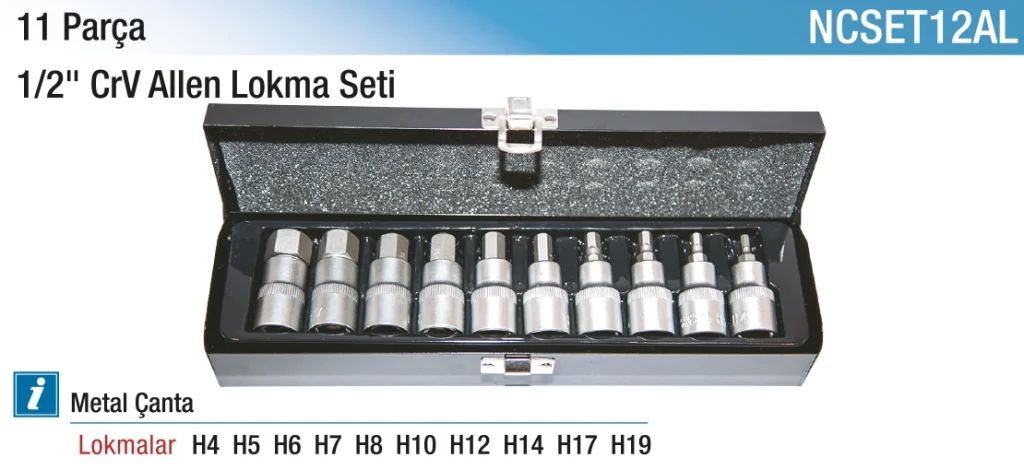 11 Parça 1/2" CR-V Allen Lokma Seti, içten altıgen Allen bağlantı elemanları için tasarlanmıştır. Yüksek kaliteli Krom Vanadyum çelik yapısıyla uzun ömürlü ve dayanıklı bir kullanım sağlar. 1/2" tahrik sistemine uyumlu olması, güçlü lokma kollarıyla birlikte profesyonel tamir işlerinde üstün performans sunar. Elektronik, makine ve otomotiv sektörlerinde hassas işler için ideal bir settir. Kolay taşınabilir kutusu ile her ortamda düzenli kullanım sağlar.