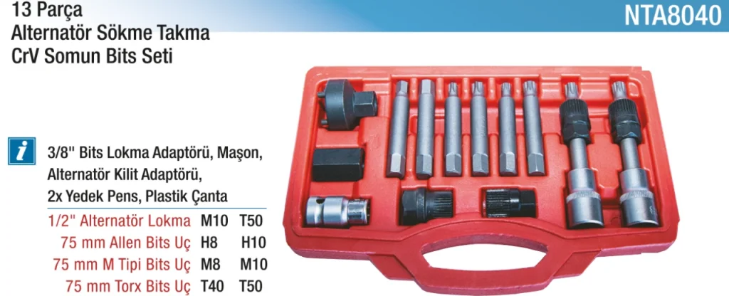13 Parça Alternatör Sökme Takma Somun Seti, araç alternatörlerinin sökülüp takılması için özel olarak geliştirilmiş profesyonel bir settir. Farklı marka ve model araçlara uygun çeşitli lokma uçları içerir. Set, alternatör kasnaklarını yerinden çıkarma ve yeniden sabitleme işlemlerini hızlı ve güvenli şekilde yapmanıza olanak tanır. Yüksek kaliteli çelik malzemeden üretilmiş bu parçalar, yüksek torka dayanıklıdır. Otomotiv servisleri, tamirciler ve ustalar için vazgeçilmez bir yardımcıdır. Sağlam saklama kutusu sayesinde parçalar kaybolmaz, iş sırasında hızlı erişim sağlar.