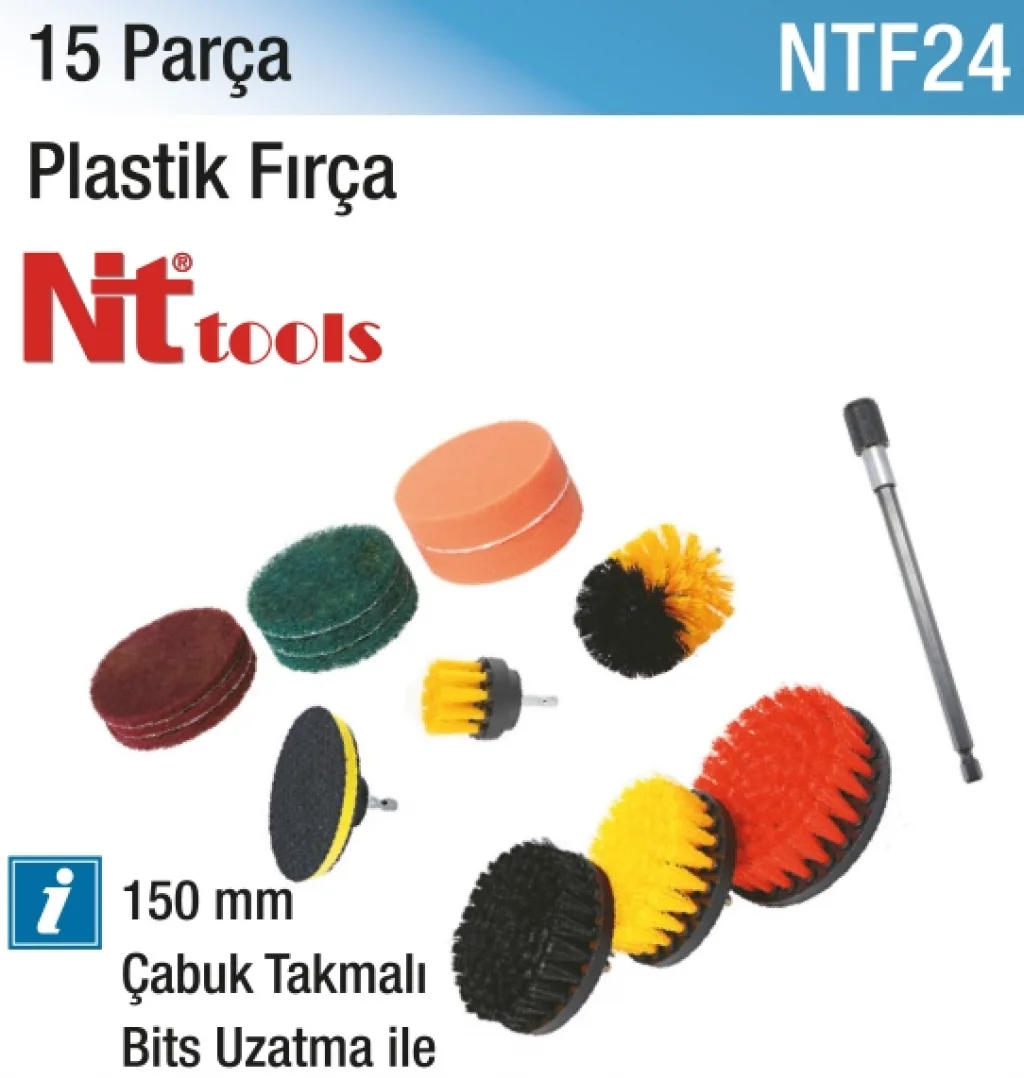 15 Parça Plastik Matkap Fırça Seti, evsel ve endüstriyel temizlik işlerini hızlandırmak için tasarlanmış pratik bir fırça setidir. Matkap veya vidalama cihazlarına bağlanabilen farklı boy ve sertlikte fırçalar; fayans, banyo, lavabo, jant, mutfak, halı ve benzeri yüzeylerde etkili temizlik sağlar. Plastik kılları, çizmeden derinlemesine temizlik yapar. Her yüzeye uygun fırça tipi içeren set, ergonomik taşıma kutusu ile birlikte sunulur. Zaman tasarrufu sağlarken temizlik performansını maksimuma çıkarır. Hızlı tak-çıkar adaptör sayesinde her matkapla uyumludur. Profesyonel temizlik işlerinde de kullanılabilir.