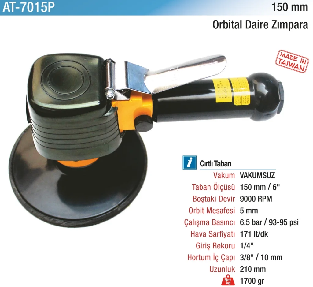 150 mm 9000 RPM Havalı Orbital Daire Zımpara, güçlü motoru ve 9000 RPM hızında yüksek performanslı zımparalama sunar. Metal, ahşap ve plastik yüzeylerde mükemmel zımparalama işlemleri sağlar. Yüksek hızda çalışma kapasitesi, işlerinizi hızlı bir şekilde tamamlamanıza olanak tanır.