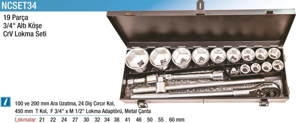 Hepsicinde 19 Parça 3/4" Altı Köşe CR-V Lokma Seti, yüksek kaliteli CR-V malzemeden üretilmiştir. Dayanıklı ve işlevsel yapısı ile uzun ömürlü bir kullanım sunar. Uygun fiyatıyla dikkat çeken bu set, her türlü işinizi kolaylıkla halledebilmeniz için tasarlanmıştır.