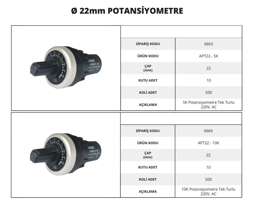 22mm çapında potansiyometreler, kontrol panolarına doğrudan monte edilebilen ve gerilim/akım seviyesini manuel olarak ayarlamaya yarayan analog direnç elemanlarıdır. Ayarlanabilir yapısıyla kullanıcıya hassas ayar imkanı sunar.