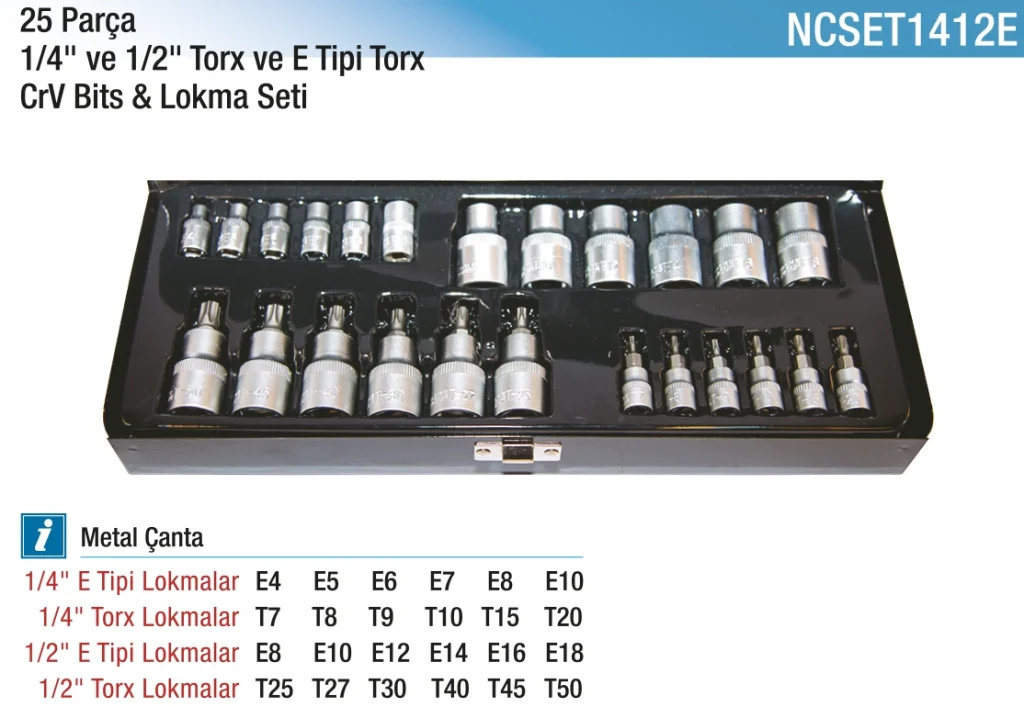 Hepsicinde 25 parça 1/4" ve 1/2" CR-V Torx ve E Tipi Torx lokma seti, dayanıklı ve yüksek kaliteli malzemeden üretilmiştir. Profesyonel tamirat işlerinizde ihtiyacınız olan tüm parçaları içinde bulunduran bu set, işinizi kolaylaştıracak ve hızlandıracak. Uzun ömürlü ve işlevsel tasarımıyla her türlü tamirat işinde kullanabilirsiniz.