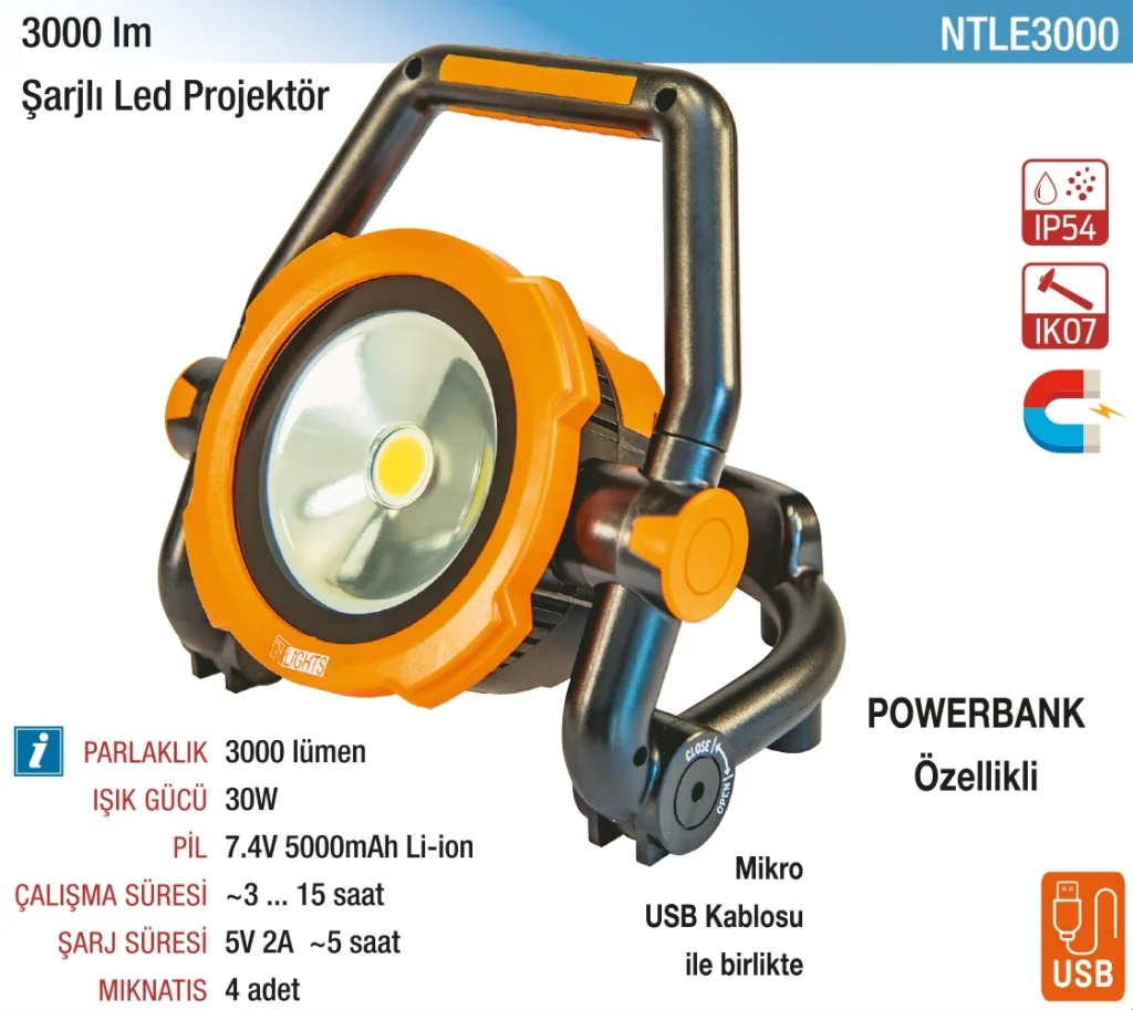 3.000 Lümen Şarjlı Led Projektör, geniş alanları güçlü ve homojen aydınlatmak için tasarlanmış profesyonel bir cihazdır. Yüksek kapasiteli şarj edilebilir bataryası ile uzun süre kesintisiz çalışma sağlar. Dayanıklı ve su geçirmez gövdesi sayesinde dış mekan ve iş sahalarında üstün performans gösterir. Ayarlanabilir ışık açısı ve taşıma sapı ile kullanım kolaylığı sağlar. Kamp, inşaat, acil müdahale ve güvenlik uygulamalarında vazgeçilmez bir aydınlatma çözümüdür.