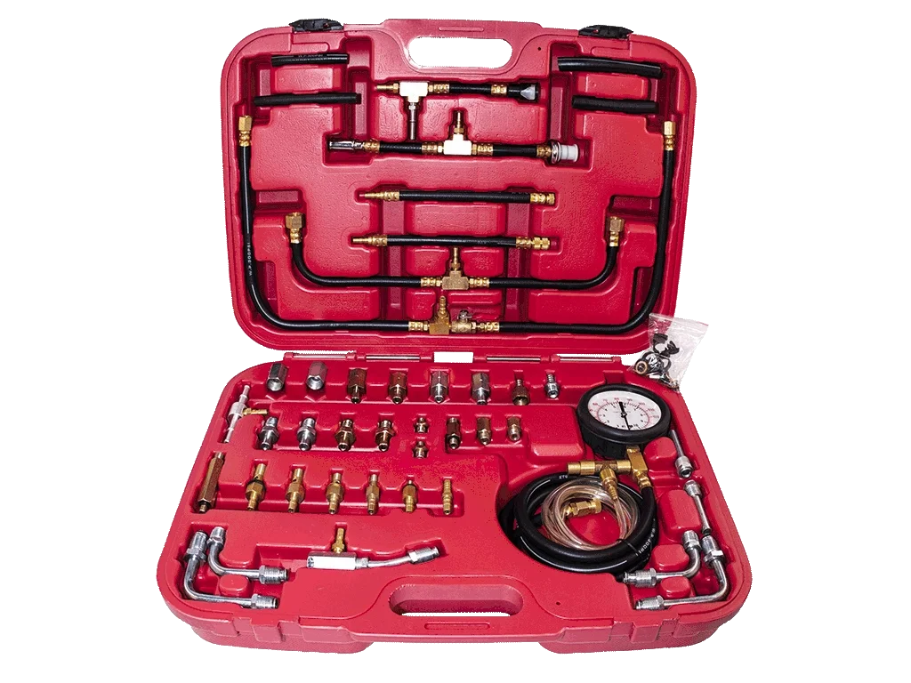 45 Parça Yakıt Sistemi Basıncı Test Cihazı, benzinli motorlarda yakıt hattı basıncını hızlı ve güvenilir bir şekilde ölçmek için tasarlanmış profesyonel bir test setidir. Otomotiv servisleri, tamirciler ve araç bakım uzmanları için özel olarak hazırlanmış bu kapsamlı set, farklı marka ve model araçlarla yüksek uyumluluk sunar.