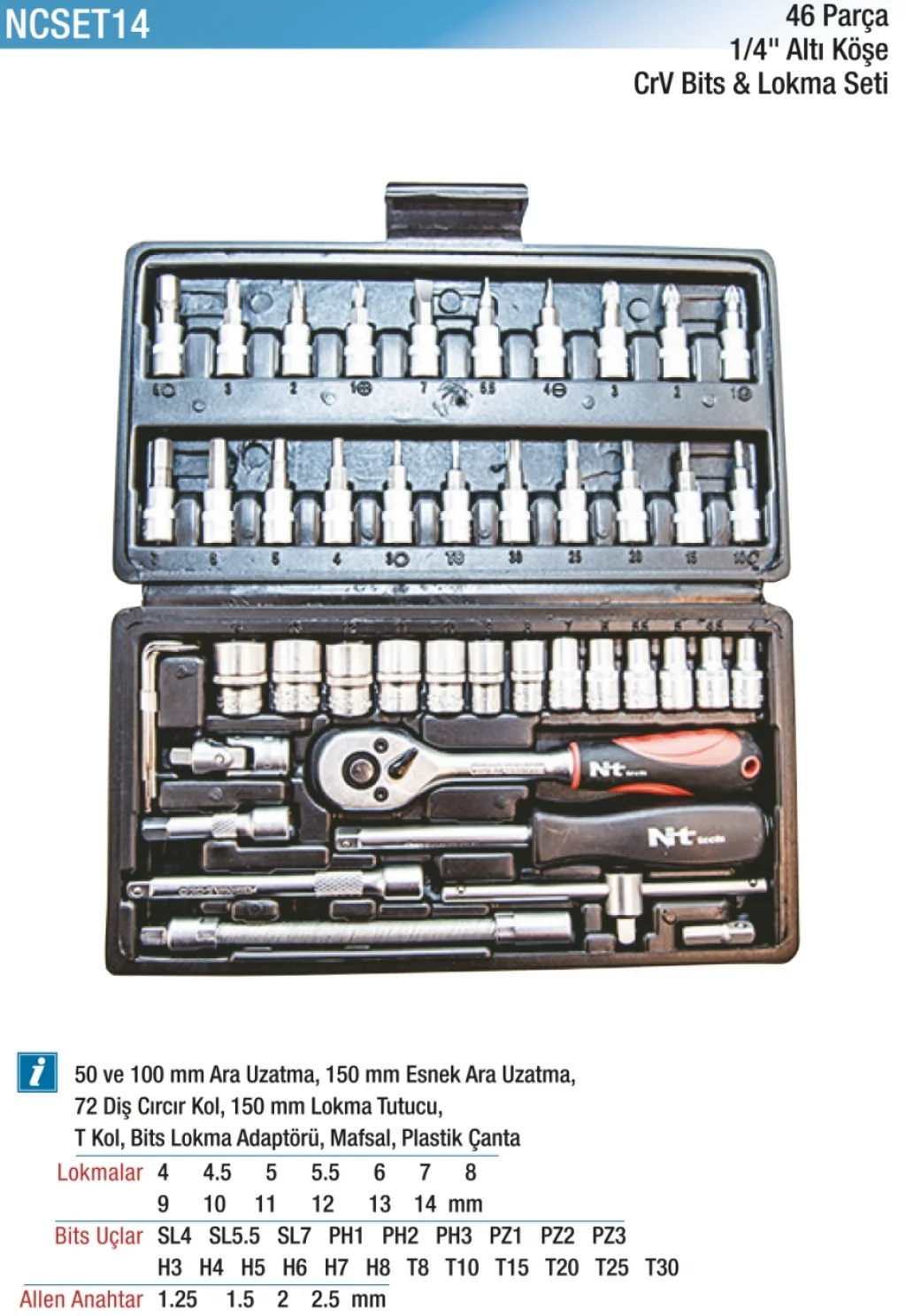 46 Parça 1/4" Altı Köşe CR-V Bits ve Lokma Seti, günlük tamirat ve montaj işlerinizde elinizin altında olması gereken kompakt bir takım çantasıdır. Krom Vanadyum çeliğinden imal edilen lokmalar ve bits uçları, dayanıklılığı ve yüksek tork taşıma kapasitesiyle öne çıkar. 1/4" tahrik uyumlu parçalar, küçük alanlardaki hassas işlemler için idealdir. Set içerisinde çeşitli lokma boyları, bits uçları, adaptörler ve uzatma çubukları bulunur. Pratik taşıma kutusu ile düzenli saklanabilir. Hobi kullanıcılarından profesyonel ustalara kadar her kesim için kullanışlı bir çözümdür.