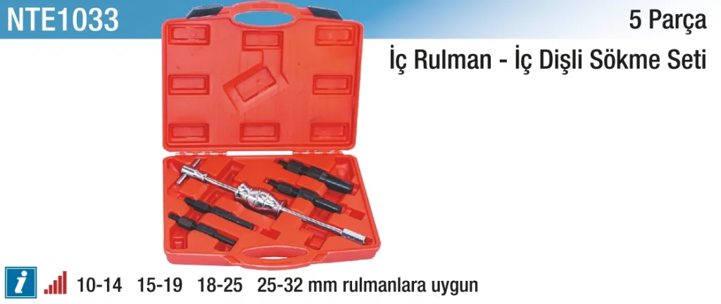 5 Parça İç Rulman - İç Dişli Sökme Seti, otomobil, motosiklet, endüstriyel makineler ve küçük motorlardaki iç rulman ve dişli sökme işlemleri için geliştirilmiştir. Dar alanlarda çalışmaya uygun, sağlam çelikten üretilmiş aparatlar sayesinde iç rulmanlar hızlı ve güvenli şekilde çıkarılır.