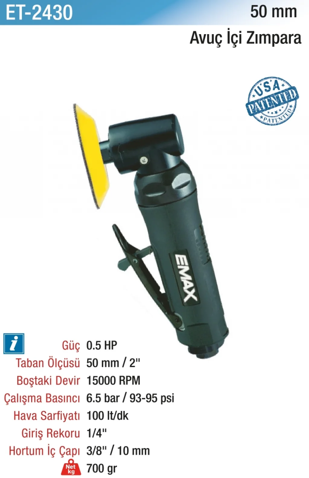 Hepsicinde 50mm.15000RPM Hav.0.5HP Havalı Avuç İçi Zımpara, güçlü motoru ve dayanıklı yapısıyla her türlü yüzeyde etkili sonuçlar verir. İşlerinizi hızlı ve kolay bir şekilde tamamlamanıza yardımcı olur. Profesyonel kullanım için tasarlanmış olan bu zımpara makinesi, atölye veya garajınızda vazgeçilmez bir araç olacak