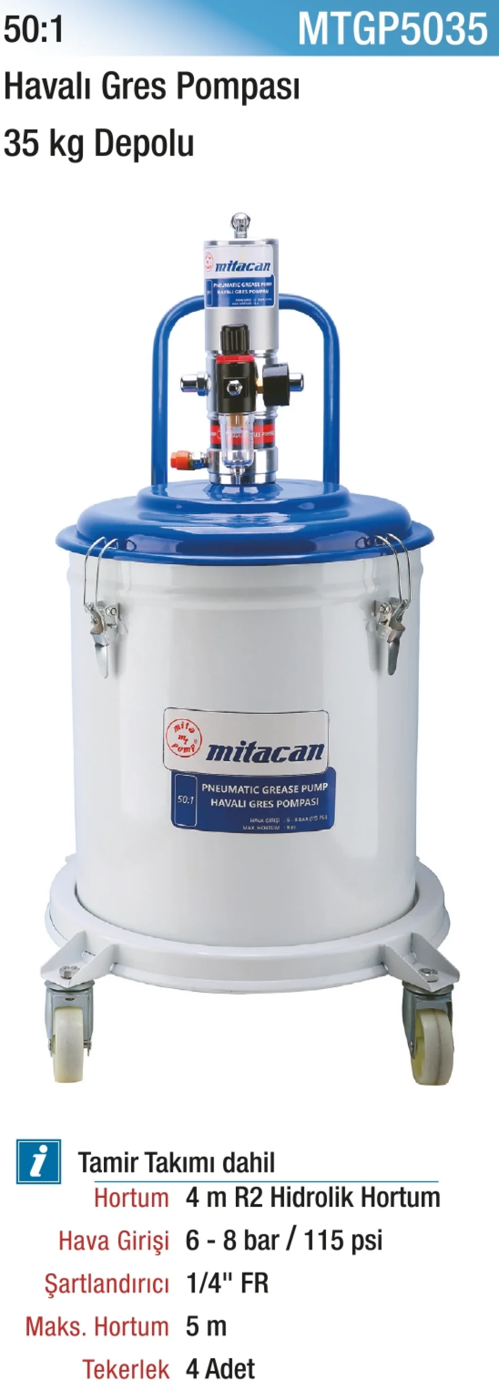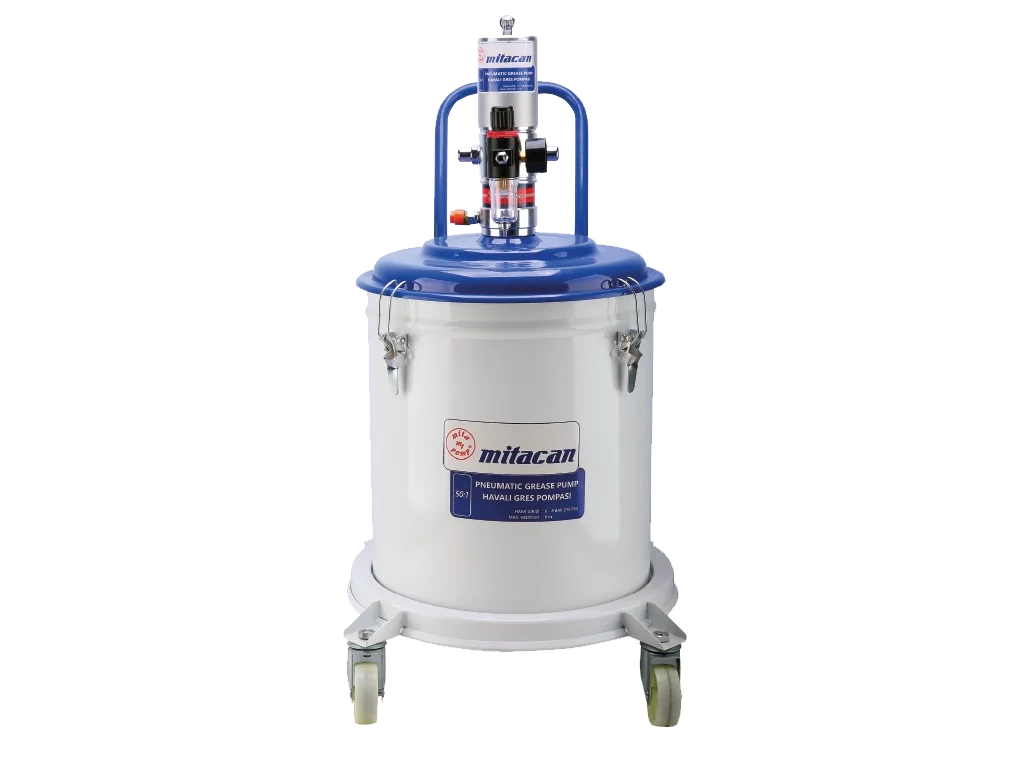 50:1 35 kg. Depolu Havalı Gres Pompası, yüksek hacimli gres ihtiyacı olan endüstriyel işletmeler için tasarlanmış, güçlü ve dayanıklı bir yağlama ekipmanıdır. 50:1 basınç oranı sayesinde yoğun ve sert gresleri bile uzak ve dar noktalara güçlü bir şekilde iletir. 35 kilogramlık geniş haznesi sayesinde, sürekli gres takviyesi yapma ihtiyacını ortadan kaldırır, iş akışında zaman kazandırır. Sağlam çelik yapısı ve sızdırmaz conta sistemi, uzun ömürlü ve güvenli kullanım sağlar. Tekerlekli şasi ile mobil taşımaya uygundur. Makine parkurlarında, inşaat sahalarında ve tarım ekipmanlarında kesintisiz yağlama sağlar. Gresleme işlemlerinde profesyonel sonuçlar isteyen işletmeler için ekonomik ve güçlü bir tercihtir.