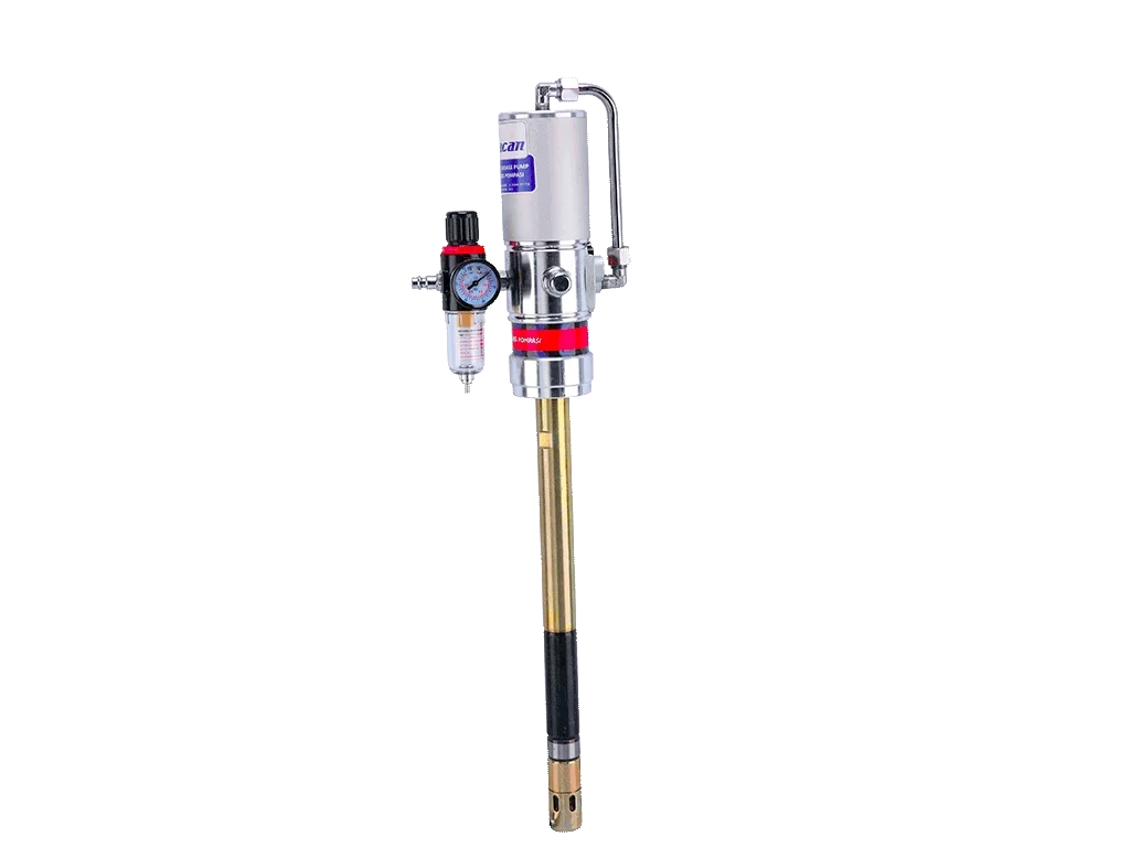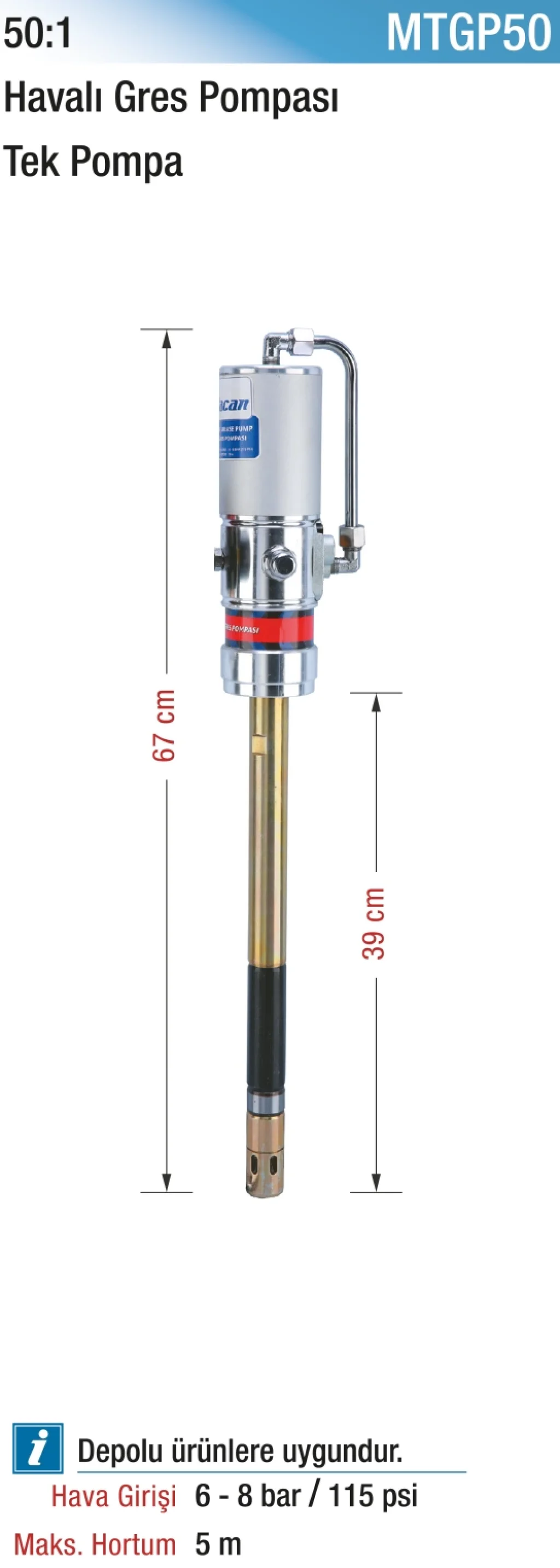50:1 Havalı Gres Pompası – Tek Pompa, endüstriyel makineler, inşaat araçları ve tarım ekipmanlarının yağlama sistemlerinde kullanılmak üzere tasarlanmış yüksek basınçlı bir gres dağıtım cihazıdır. 50:1 basınç oranı, düşük hava tüketimiyle 50 katına kadar güç sağlar; bu sayede en sert gres bile terminal noktalarına ulaşır. Tek pompa tasarımı, basit montaj ve az bakım gerektirir. Ergonomik tutma sapı, uzun çalışma sürelerinde bile kullanıcı konforu sağlar. Paslanmaz çelik piston ve valf sistemi, aşınma ve korozyona karşı dayanıklıdır. Standart gres namlusu ve çeşitli uç adaptörleriyle uyumlu çalışır. Atölye, fabrika ve sahada mobil yağlama ekipmanlarının vazgeçilmez aracı olarak, makinelerin verimli çalışmasını korur ve operatörlerin iş yükünü hafifletir.