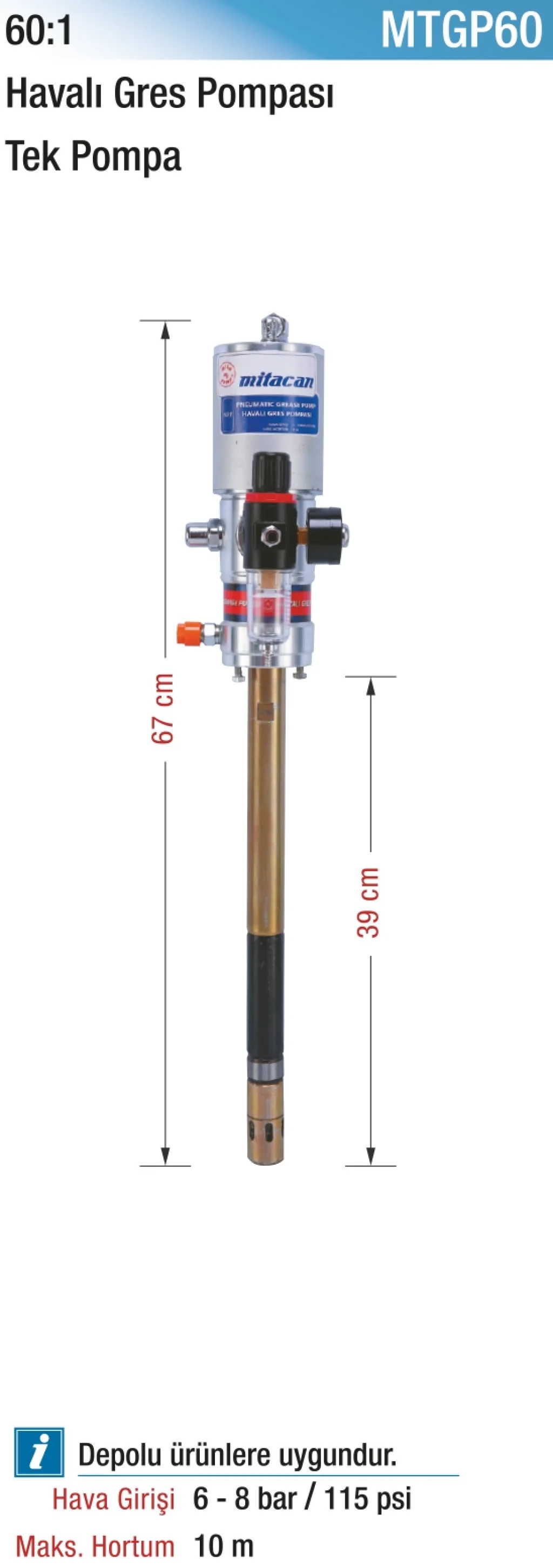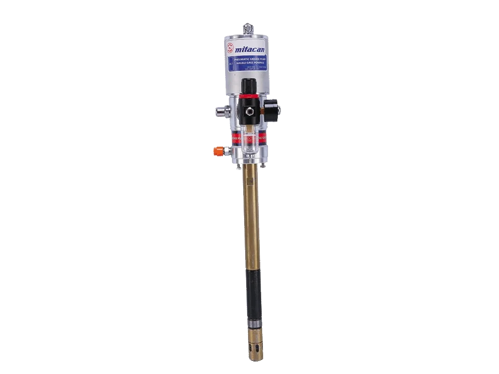 60:1 Havalı Gres Pompası – Tek Pompa, daha yüksek basınç gerektiren ağır şartlarda profesyonel gresleme çözümleri sunmak için geliştirilmiştir. 60:1 oranı, düşük hava tüketimiyle yüksek çıkış basıncı sağlar; böylece zorlu yağlama noktalarında bile etkin performans elde edilir. Kompakt tek pompa tasarımı, kolay montaj ve düşük bakım avantajı sunar. Paslanmaz piston ve valf sistemi, uzun ömür ve yüksek dayanıklılık sağlar. Çeşitli uç adaptörleriyle uyumludur ve sabit ya da mobil sistemlere entegre edilebilir. Fabrika, bakım atölyesi ve sahada ağır makine greslemesi için güvenilir bir tercihtir.