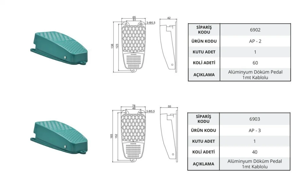 6903 AP-3 alüminyum döküm pedal, dayanıklı malzemesi ve ergonomik tasarımı ile konforlu kullanım sağlar. Özellikle endüstriyel ve atölye ortamlarında yoğun kullanıma uygundur. Hafif ama sağlam yapısı, uzun süre deformasyona uğramadan performans sunar. Kaymaz yüzeyi ile güvenli kullanım olanağı sağlar. Çeşitli makinelerde ve ekipmanlarda kumanda ve kontrol amaçlı tercih edilen yüksek kalite bir pedaldır.