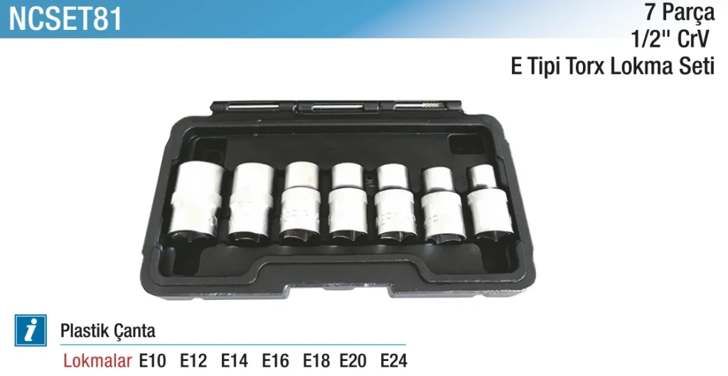 7 Parça 1/2" CR-V E Tipi Torx Lokma Seti, araç tamiri, beyaz eşya montajı ve çeşitli endüstriyel uygulamalarda sıklıkla kullanılan E tipi (dış torx) cıvatalar için idealdir. CR-V (Krom Vanadyum) çelikten imal edilen lokmalar, yüksek tork altında bile deformasyona uğramaz. 1/2” tahrik uyumu sayesinde profesyonel aletlerle mükemmel uyum sağlar. Kompakt yapısı, az yer kaplar ve taşıması kolaydır. Farklı boyutlardaki E tipi lokmalarla, çeşitli çapta bağlantı elemanlarını rahatlıkla söküp takabilirsiniz. Pratik kutusu sayesinde atölye düzenini korur.