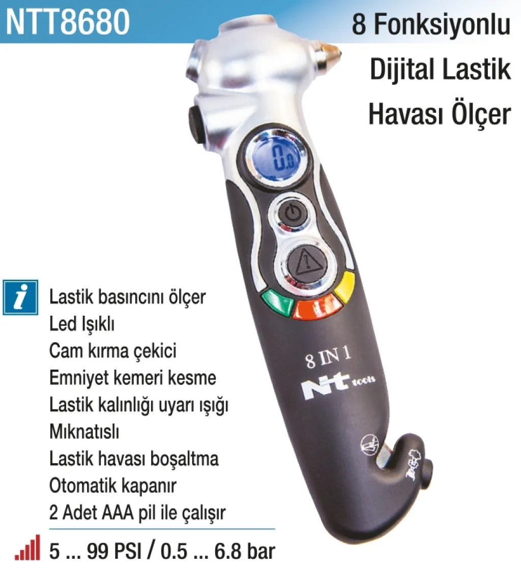 8 Fonksiyonlu Dijital Lastik Havası Ölçer, lastik basıncı ölçümünün yanı sıra sıcaklık ve diğer önemli verileri de ölçebilme özelliğine sahip gelişmiş bir cihazdır.