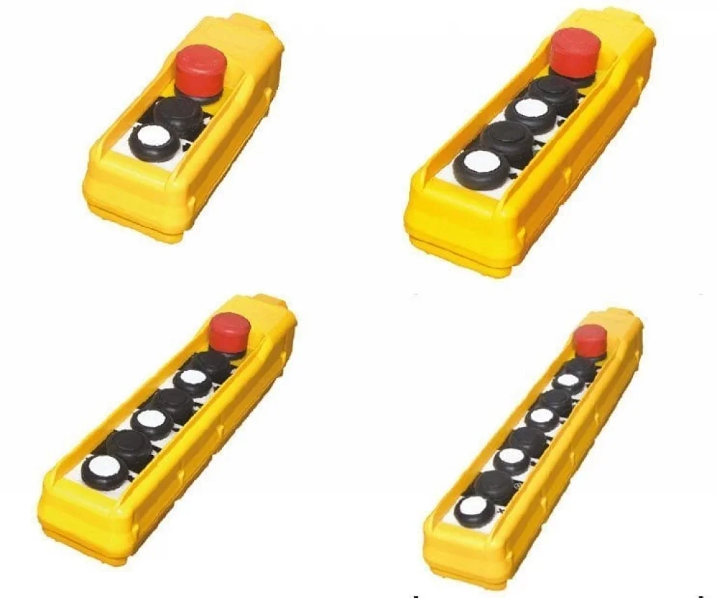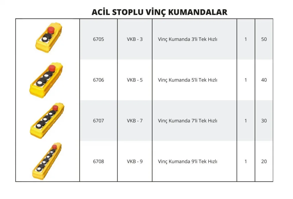 Acil stoplu vinç kumandaları, kaldırma sistemlerinde operatör güvenliğini ön planda tutan acil durdurma butonuna sahiptir. Ergonomik gövde dizaynı, tek elle kullanım kolaylığı sağlar. Kablo veya kablosuz modelleriyle esneklik sunar.
