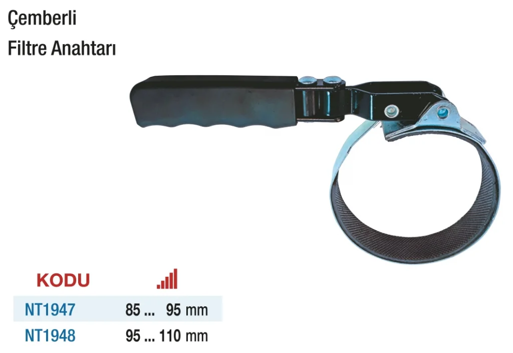Çemberli Filtre Anahtarı, filtreleri çepeçevre sararak sıkı kavrama sağlayan klasik ama etkili bir sökme aracıdır. Sağlam çelik çemberi filtreye tam oturur ve sökme sırasında kayma riskini ortadan kaldırır. Tüm motor yağı ve yakıt filtreleriyle uyumludur. El ergonomisine uygun sapı sayesinde konforlu bir kullanım sunar. Her araç bakım çantasında bulunması gereken temel el aletlerinden biridir.