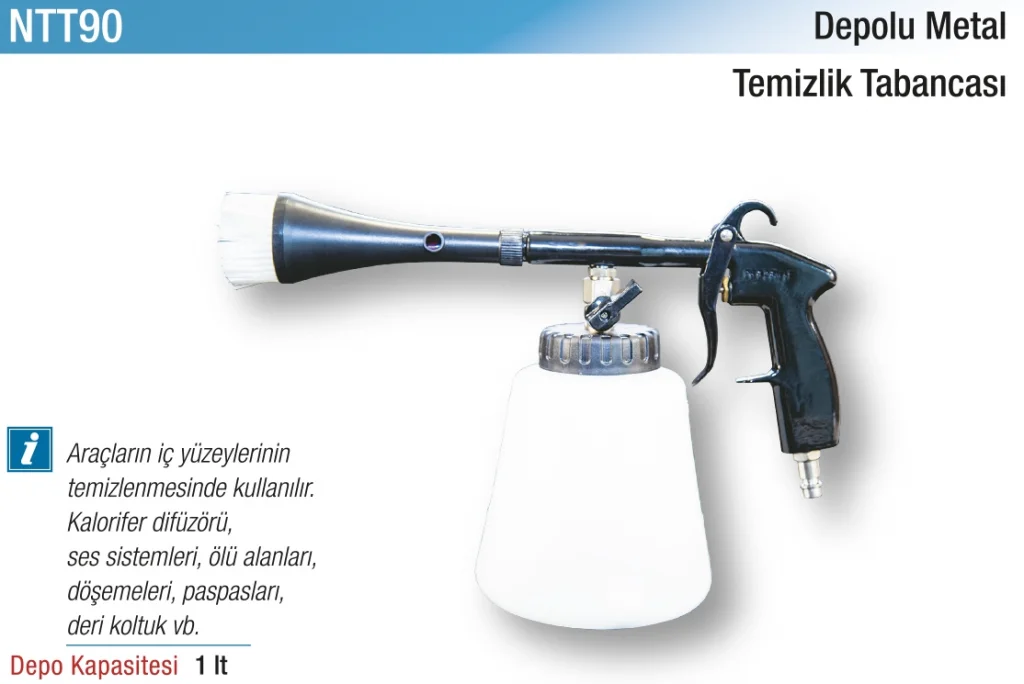 Köpüklü veya sıvı temizlik maddeleriyle birlikte kullanıma uygundur. Hava kompresörü ile çalışarak yüksek basınçlı püskürtme sağlar. Özellikle koltuk, zemin ve havalandırma kanalları gibi alanlarda etkili temizlik sunar.