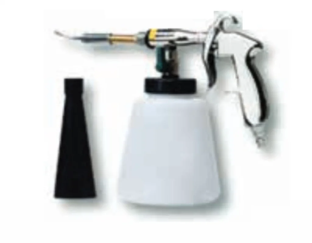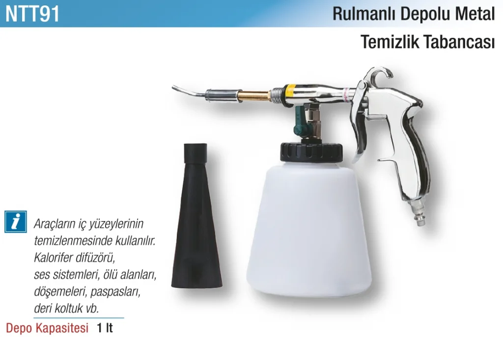 Üzerindeki sıvı hazneye deterjan, dezenfektan ya da köpüklü temizlik solüsyonu konulabilir. Kompresör bağlantısıyla çalışan bu ürün, araç koltuklarından halılara, plastik yüzeylerden motor temizliğine kadar geniş bir kullanım alanına sahiptir.