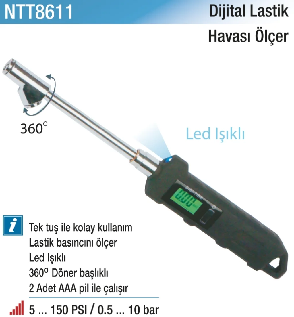 Dijital Lastik Havası Ölçer, dijital ekranı sayesinde lastiklerinizin havasını hızlı ve doğru bir şekilde ölçmenizi sağlar.