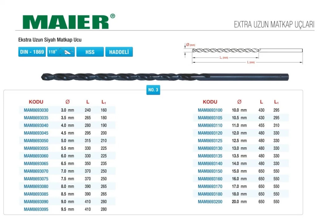 DIN 1869 Siyah No.3 Çok Uzun Silindirik Saplı Matkap Uçları, yüksek kaliteli malzemeden üretilmiş ve uzun ömürlüdür. İşlevselliği ve dayanıklılığı ile dikkat çeker, en zorlu işlerde bile mükemmel performans sağlar. Uzun süreli kullanım için ideal bir seçimdir.