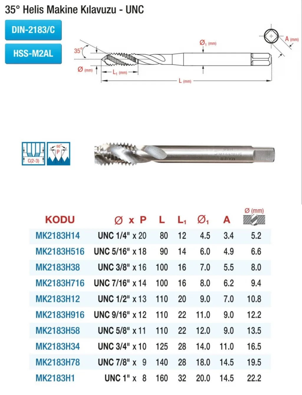 DIN 2183 35° Helis Kanal - UNC - HSS Makine Kılavuzları, yüksek kaliteli malzemeden üretilmiş, dayanıklı ve işlevsel bir üründür. Uygun fiyatı ile dikkat çeken bu kılavuzlar, her türlü işlemde size kolaylık sağlar. Profesyonel kullanım için idealdir.