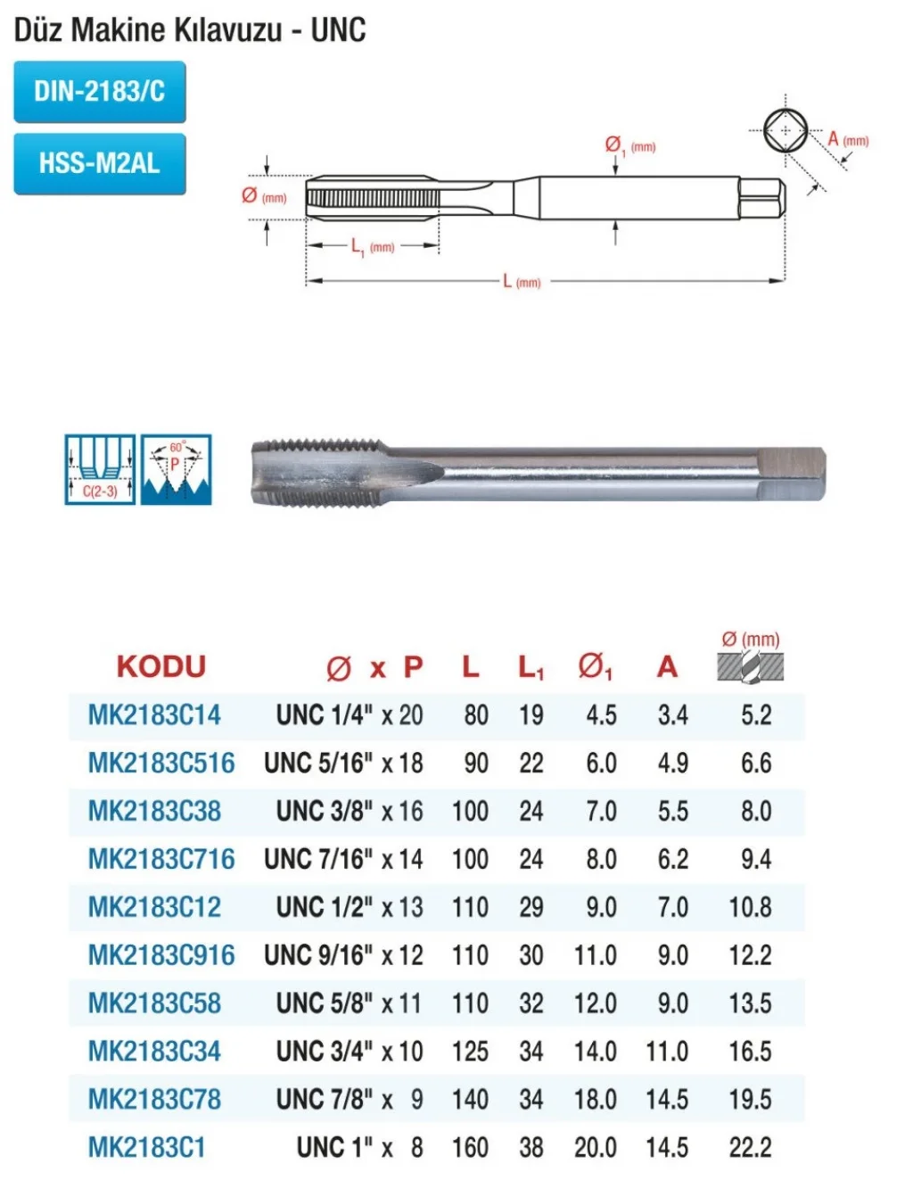 DIN 2183 DÜZ KANAL - UNC - HSS MAKİNE KILAVUZLARI, CNC makineleri için tasarlanmış yüksek kaliteli kılavuz setidir. Dayanıklı malzemeden üretilmiş olup uzun ömürlü kullanım sağlar. Profesyonel işlerinizde güvenle kullanabilirsiniz.