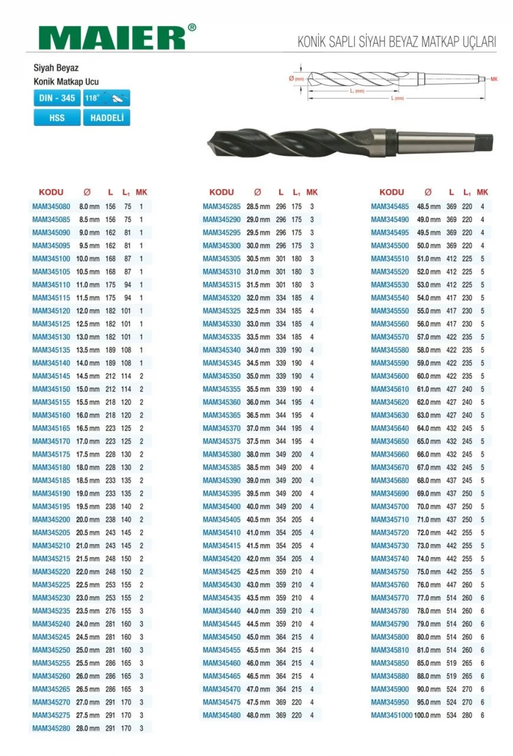 DIN 345 Siyah Beyaz Konik Saplı Matkap Uçları, yüksek kaliteli malzemeden üretilmiş dayanıklı ve işlevsel matkap uçlarıdır. Profesyonel ve hobi kullanımlar için idealdir. Uzun ömürlü kullanım sağlar.