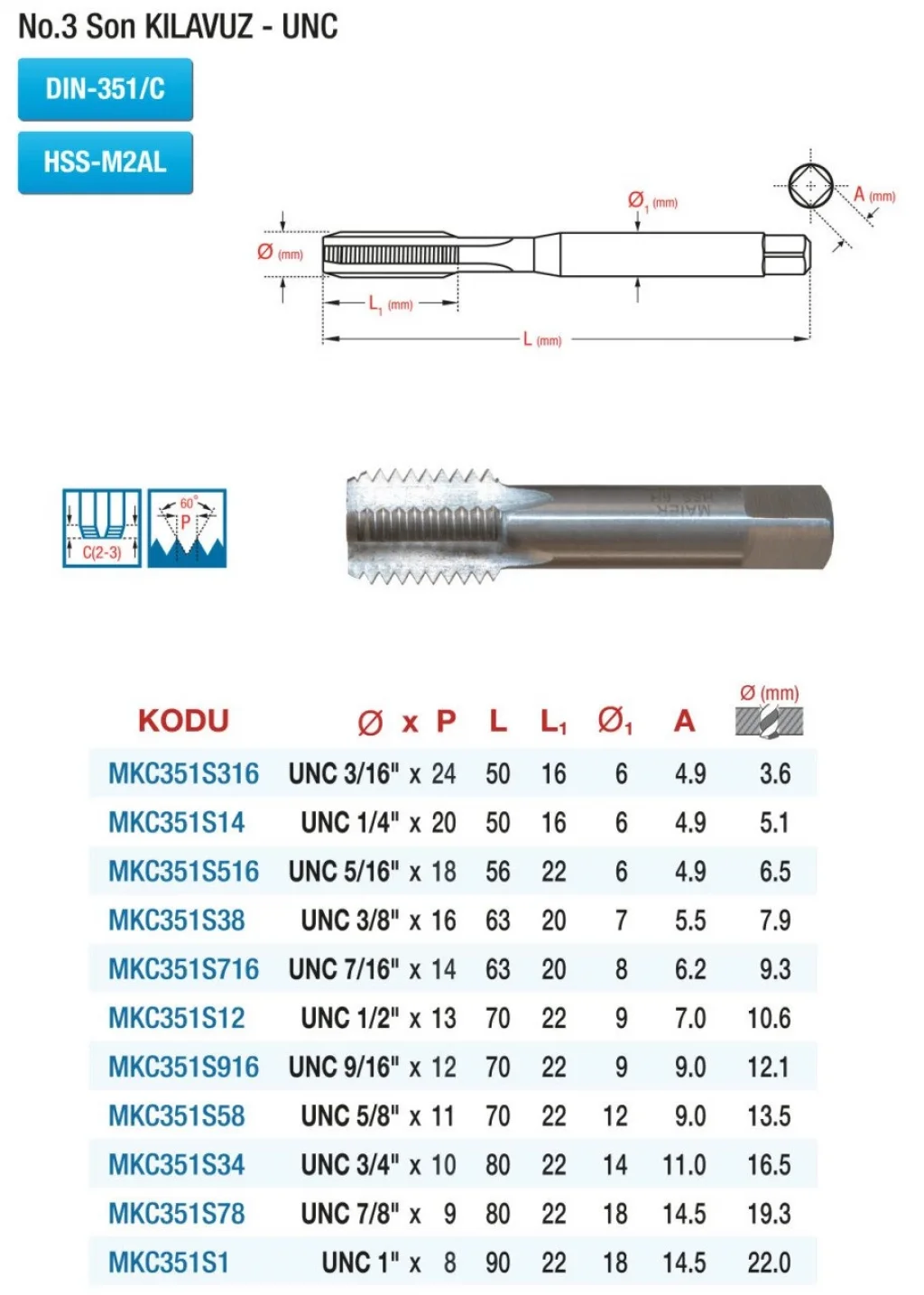 DIN 351 NO.3 SON KILAVUZ - UNC - HSS El Kılavuzları, yüksek kaliteli HSS malzemeden üretilmiş olup dayanıklı ve işlevsel bir yapıya sahiptir. Profesyonel kullanım için ideal olan bu kılavuzlar, işlerinizi kolaylaştırmak için tasarlanmıştır. Uzun ömürlü ve sağlam yapısıyla her türlü işte size yardımcı olacaktır. Tüm ihtiyaçlarınızı karşılamak için DIN 351 NO.3 SON KILAVUZ - UNC - HSS El Kılavuzlarını