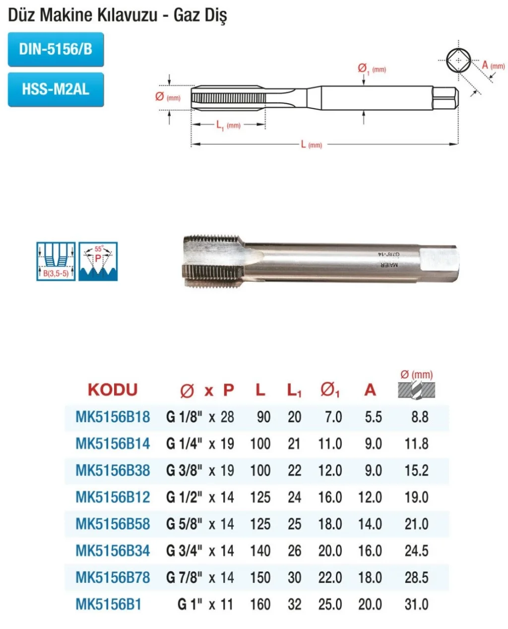 DIN 5156 Düz Kanal - Gaz Diş - HSS Makine Kılavuzları, yüksek kaliteli malzemeden üretilmiş, dayanıklı ve işlevsel bir üründür. Her türlü makine için uygundur ve uzun ömürlü kullanım sağlar. İşlerinizi hızlı ve kolay bir şekilde tamamlamanıza yardımcı olacak bu kılavuzlar, atölyenizdeki en değerli araçlardan biri olacaktır.