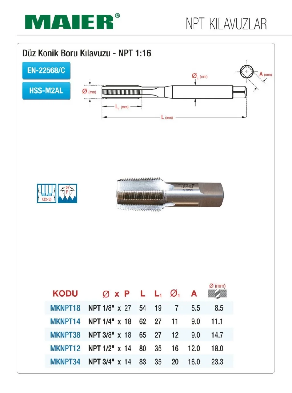 DÜZ KANAL NPT 1:16 HSS Konik Boru Kılavuzlar, yüksek kaliteli malzemeden üretilmiş, dayanıklı ve işlevsel bir üründür. Profesyonel kullanım için ideal olan bu kılavuzlar, boru işleme işlerinizde size büyük kolaylık sağlar. Kaliteli malzemesi sayesinde uzun ömürlüdür ve işlerinizi hızlı ve verimli bir şekilde tamamlamanıza yardımcı olur.