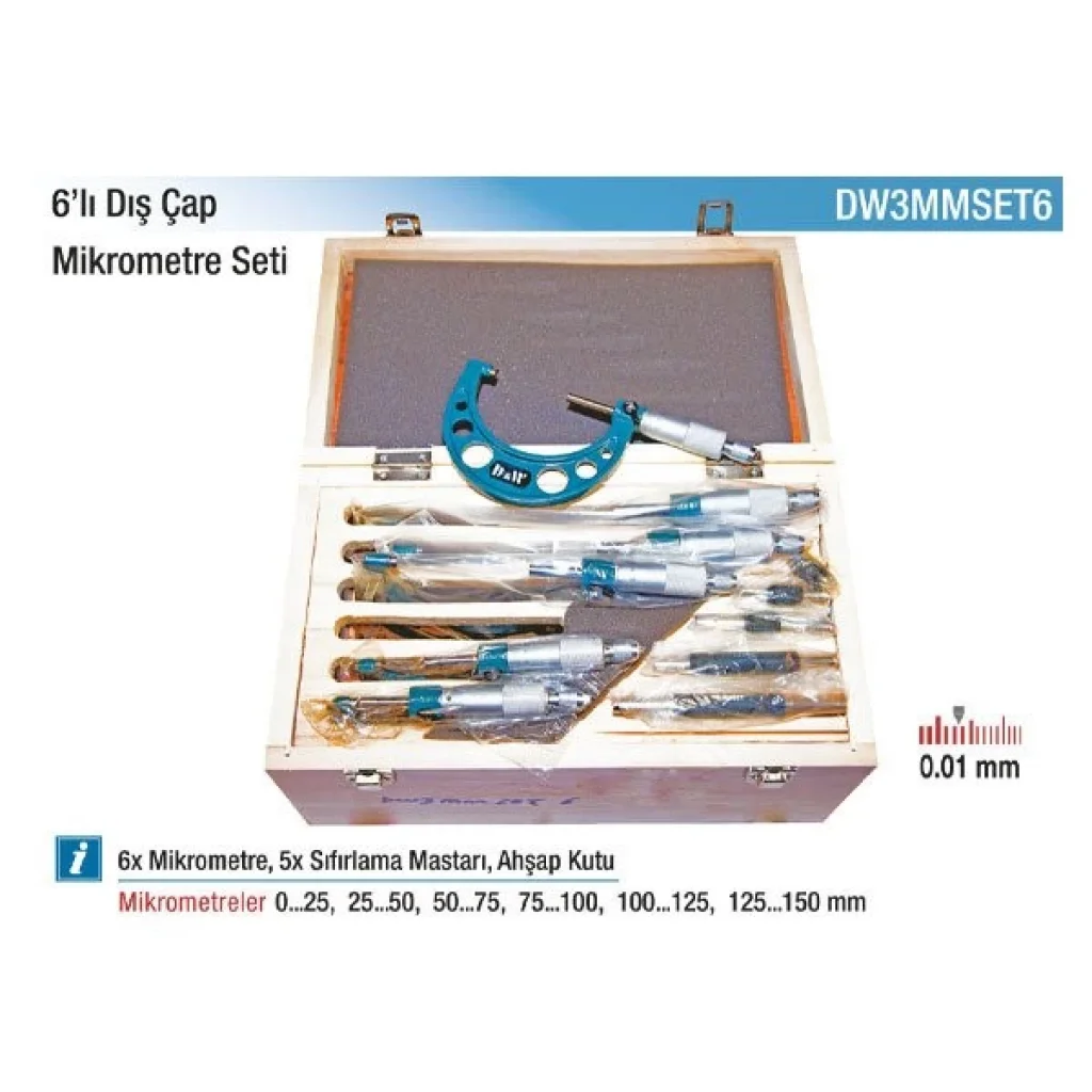 D&W 0-150 mm Arası 6 Parça Dış Çap Mikrometre Seti, hassas dış çap ölçümleri yapmak için tasarlanmış profesyonel bir settir. Set içerisinde 0-25 mm, 25-50 mm, 50-75 mm, 75-100 mm, 100-125 mm ve 125-150 mm aralıklarını kapsayan toplam 6 adet mikrometre bulunur. Her biri ayrı kalibrasyon ayarına ve hassas dişli yapısına sahiptir. Mikrometreler, mekanik parça ölçümünde, kalite kontrol ve üretim hatlarında yüksek doğruluk sağlar. Sağlam kutusu ile birlikte gelen set, taşınabilirlik ve güvenli saklama imkânı sunar. Ölçüm uzmanları ve teknik ekipler için vazgeçilmez bir çözümdür.