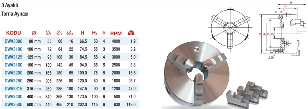 D&W 3 Ayaklı Torna Aynaları, torna tezgahlarında standart, yuvarlak veya simetrik iş parçalarının hassas ve güvenli şekilde sabitlenmesini sağlamak için özel olarak tasarlanmış iş parçası tutucu sistemleridir. Üç ayaklı sıkma yapısı, iş parçasını merkezde dengeli ve güçlü bir şekilde kavrayarak işleme sırasında kayma ve titreşimleri minimuma indirir.