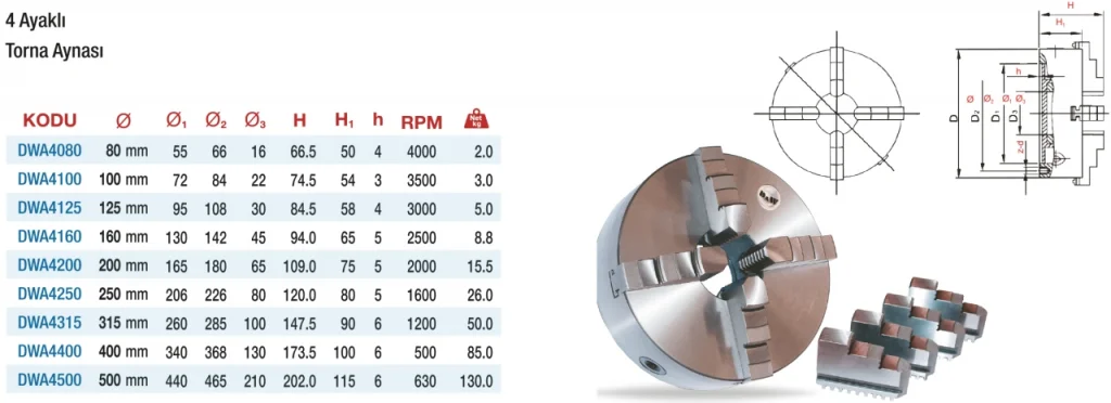 D&W 4 Ayaklı Torna Aynaları, torna tezgahlarında iş parçalarının güvenli ve hassas şekilde sabitlenmesini sağlamak için özel olarak geliştirilmiş iş parçası tutucu sistemleridir. Ayarlanabilir dört ayaklı yapısı sayesinde farklı çap, boyut ve şekillerdeki iş parçalarını kolaylıkla kavrayabilir, işleme sırasında stabil ve sağlam bir tutuş sağlar.
