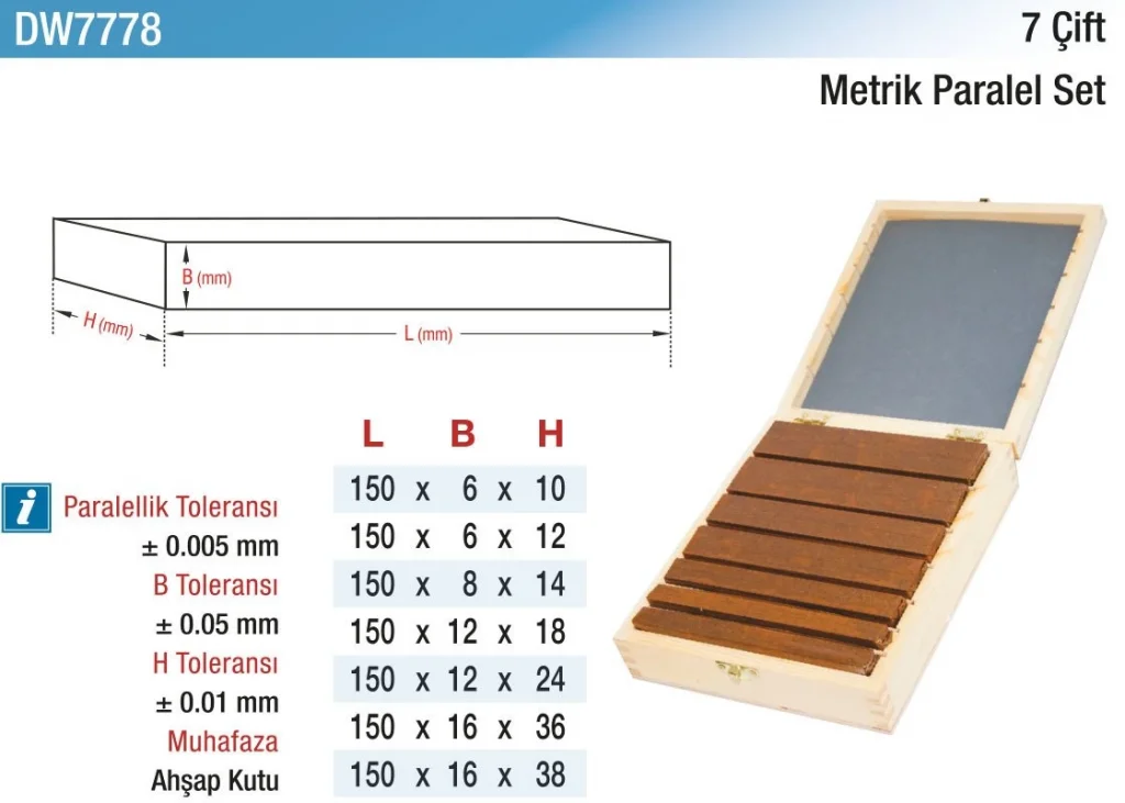 D&W 7 Çift Metrik Paralel Set 150 mm, farklı kalınlıklarda 7 çift paralel parçadan oluşur. Dayanıklı metal yapı uzun süreli ve hassas ölçüm sağlar. Makine ve teknik uygulamalarda kalibrasyon ve ölçüm kolaylığı sunar. Kompakt ve taşıması kolaydır. Endüstriyel uygulamalarda profesyonellerin güvenle kullandığı bir ölçüm setidir.