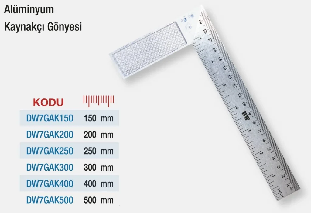 D&W Alüminyum Kaynakçı Gönyeleri, kaynak işlemlerinde kullanılmak üzere özel olarak tasarlanmıştır. Hafif ama sağlam alüminyum gövdesi, yüksek ısıya dayanıklıdır. Hassas açılı işaretlemeleri ve sert yapısı sayesinde doğru kaynak bağlantıları yapılmasına yardımcı olur. Endüstriyel kaynak uygulamalarında işinizi kolaylaştıran dayanıklı ve pratik bir araçtır. Ergonomik tasarımı, uzun süreli kullanımlarda kullanıcı konforu sağlar.