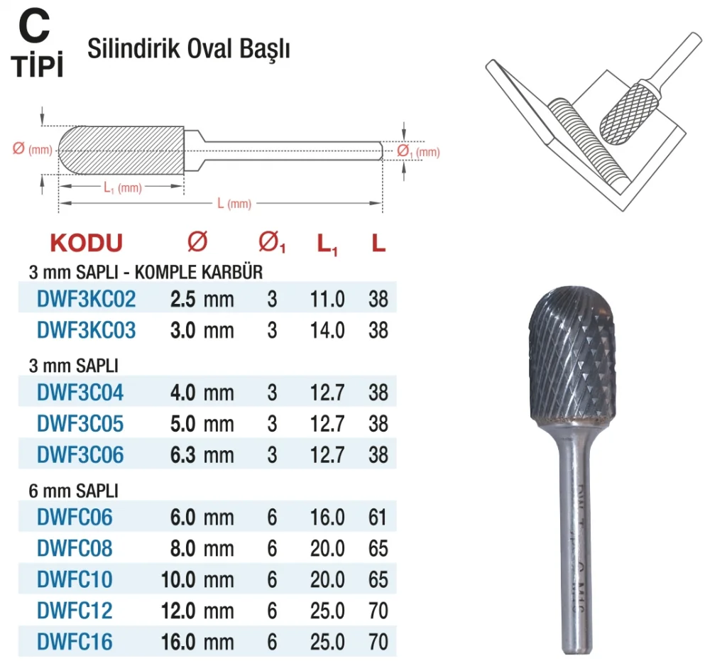Hepsicinde D&W C Tipi Silindirik Oval Başlı - Karbur Kalıpçı Frezleri, yüksek kaliteli karbür malzemeden üretilmiş dayanıklı ve işlevsel frezlerdir. Bu frezler, hassas işlemler için mükemmel sonuçlar sağlar ve uzun ömürlü kullanım imkanı sunar. Profesyonel kalıpçılar ve endüstriyel kullanıcılar için ideal bir seçimdir.