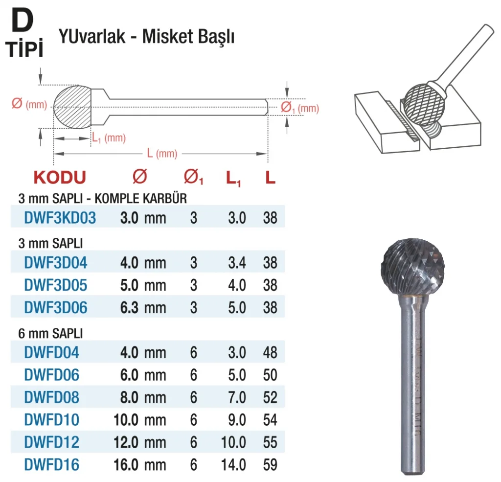 Hepsicinde D&W D Tipi Yuvarlak - Misket Başlı - Karbur Kalıpçı Frezeleri, yüksek kaliteli karbur malzemeden üretilmiştir. Dayanıklı ve işlevsel yapısıyla uzun ömürlü kullanım imkanı sağlar. Profesyonel kalıpçılar için ideal bir seçimdir.