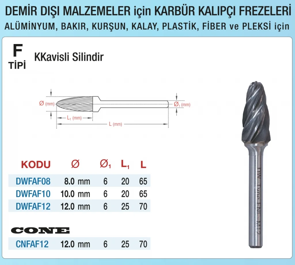 D&W Demir Dışı Malzemeler İçin F Tipi Kavisli Silindir, özellikle karbur kalıpçı frezeleriyle uyumlu, yüksek performanslı bir üründür. Endüstriyel uygulamalarda, özellikle demir dışı metallerin işlenmesinde kullanılmak üzere tasarlanmış olan bu silindir, dayanıklı yapısı sayesinde uzun ömürlü ve verimli bir kullanım sunar.