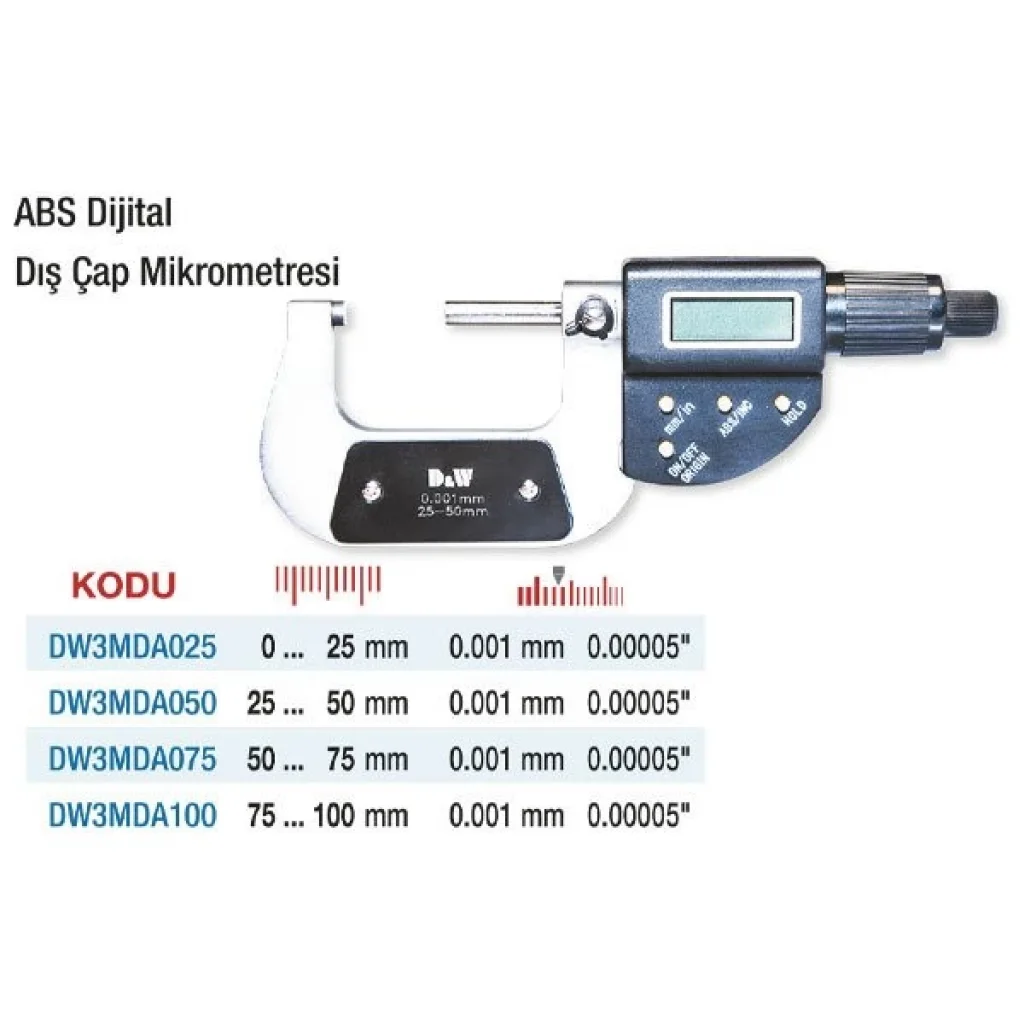 D&W Dijital ABS Diş Çap Mikrometresi, hafifliği ve dayanıklılığı bir arada sunan ABS gövdesiyle dikkat çeker. Dişli parçaların çap ölçümünü hassas şekilde yapmanızı sağlar. Geniş LCD ekran, ölçüm değerlerini net şekilde görüntülemenize olanak tanır. mm/inç geçiş, sıfırlama ve veri tutma fonksiyonları ile kullanıcı dostudur. Hafif tasarımı sayesinde uzun süreli kullanımlarda bile el yorgunluğunu azaltır. Özellikle dişli üretim tesisleri, atölyeler ve kalite kontrol laboratuvarları için ideal bir çözümdür.