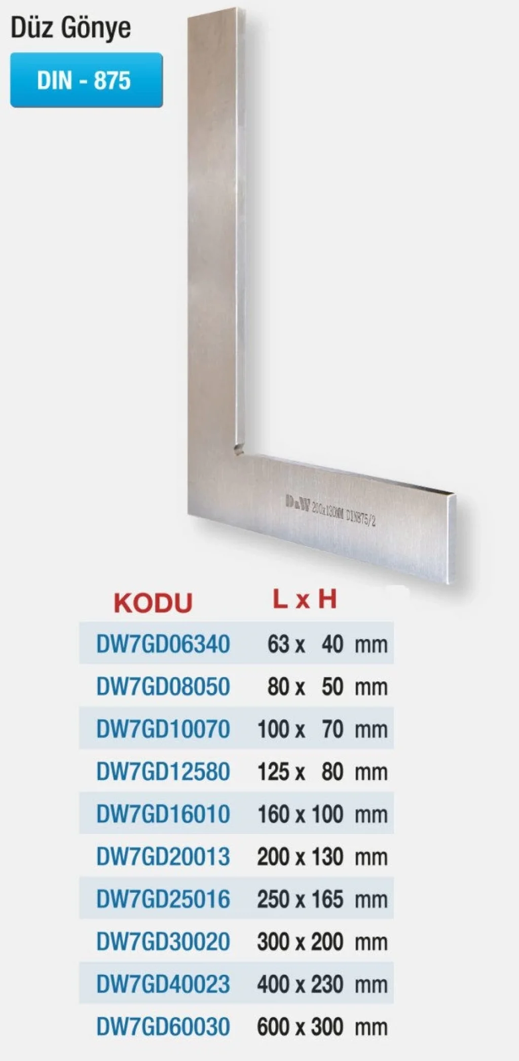 D&W Düz Gönyeler DIN 875 standardına uygun olarak, kusursuz düzlük gerektiren alanlarda referans ölçüm aleti olarak kullanılır. Paslanmaz profilli yapısı deformasyona karşı dirençlidir. Cetvel üzerindeki net işaretli çizimler, milimetrik hassasiyet sağlar. Mobilya, makine montajı, CNC kurulumları ve test tezgahlarında güvenilir ölçüm için ideal bir araçtır. ISO standardına uygunluk ölçüm güvenilirliğini artırır.