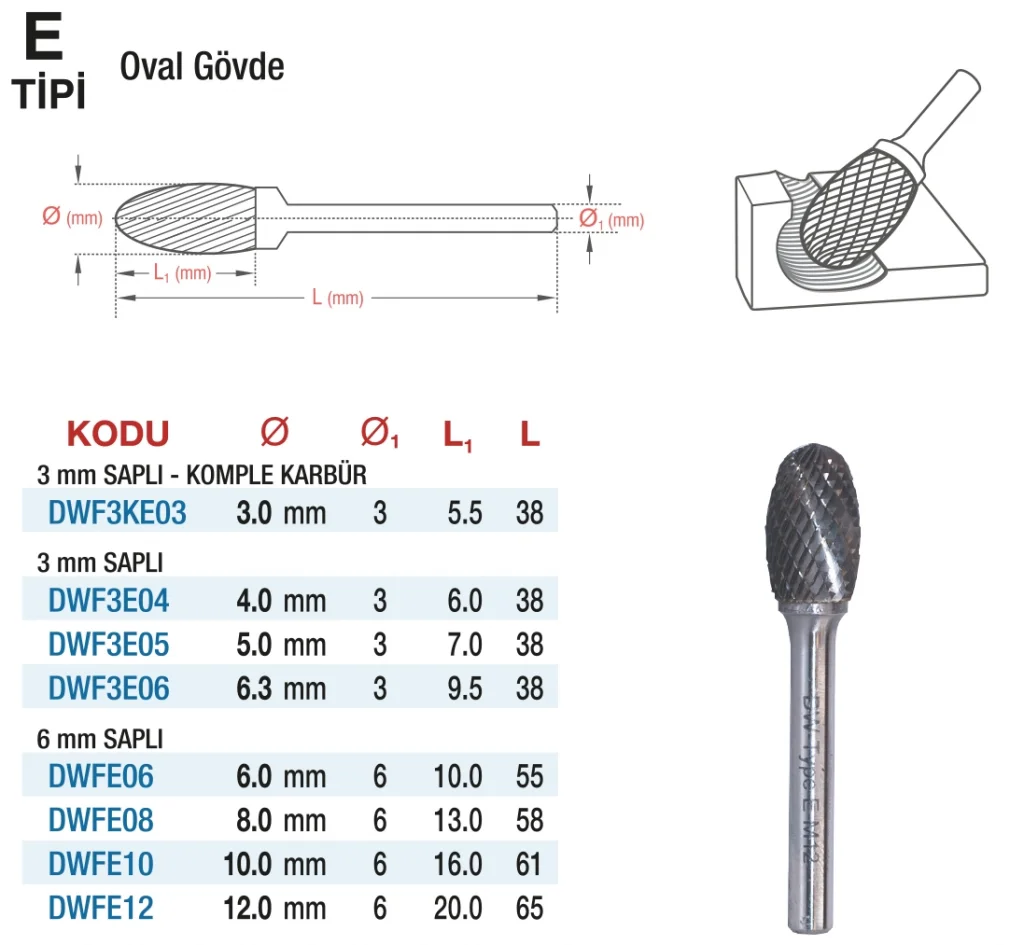 Hepsicinde D&W E Tipi Oval Gövde - Karbur Kalıpçı Frezeleri, yüksek kaliteli karbür malzemeden üretilmiş dayanıklı freze uçlarıdır. Bu frezeler, işleme sürecinde yüksek performans ve hassasiyet sunar, kesme işlemlerinde etkili sonuçlar sağlar. Sektörde tercih edilen D&W freze uçları, uzun ömürlü ve verimli bir kullanım deneyimi sunar.