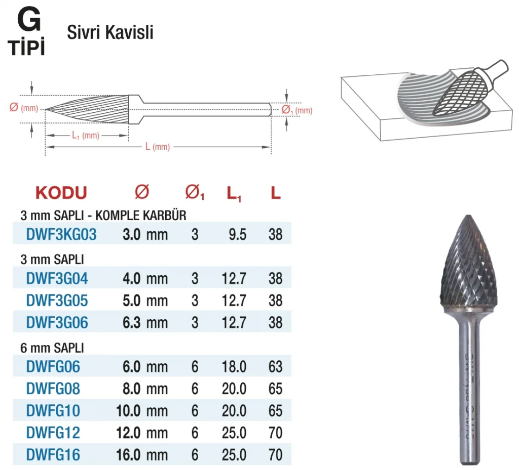 Model: D&W G Tipi Sivri Kavisli - Karbur Kalıpçı Frezeleri