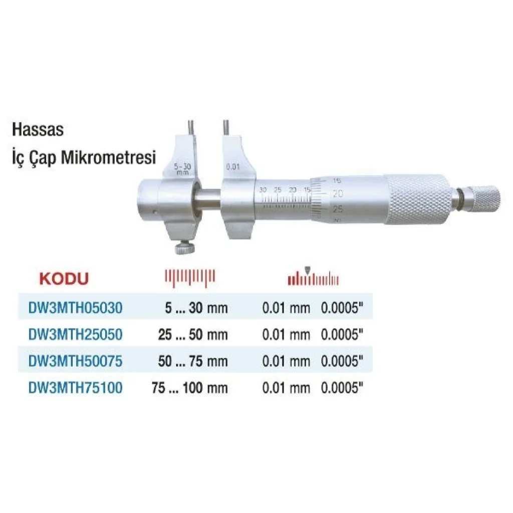 D&W Hassas İç Çap Mikrometresi, iç çap ölçüm işlemlerinde mikron seviyesinde doğruluk arayan profesyoneller için geliştirilmiştir. Ayarlanabilir ve sabit uçları sayesinde çeşitli iç çaplara kolayca uyum sağlar. Korozyona dayanıklı metal alaşımı ve hassas vida mekanizması sayesinde uzun süreli kullanımda bile performansını korur. Kalite kontrol, üretim hattı ve teknik denetim gibi alanlarda tercih edilen bu mikrometre, hem doğruluk hem de güvenilirlik sunar.