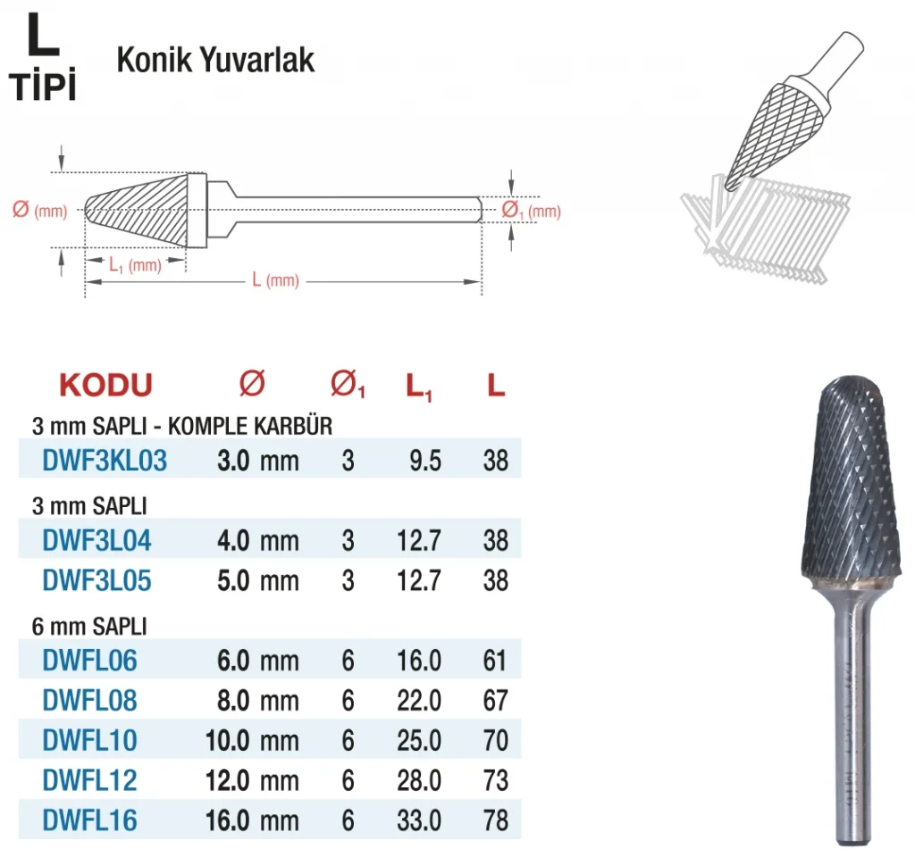 D&W L Tipi Konik Yuvarlak - Karbur Kalıpçı Frezeleri, özellikle kalıpçılık, metal işleme ve ahşap işleme sektörlerinde profesyonel kullanıcılar için tasarlanmış, yüksek kaliteli ve dayanıklı bir freze çeşididir. Karbür malzemesi ve konik yuvarlak tasarımı sayesinde zorlu işleme süreçlerinde üstün performans sunar.
