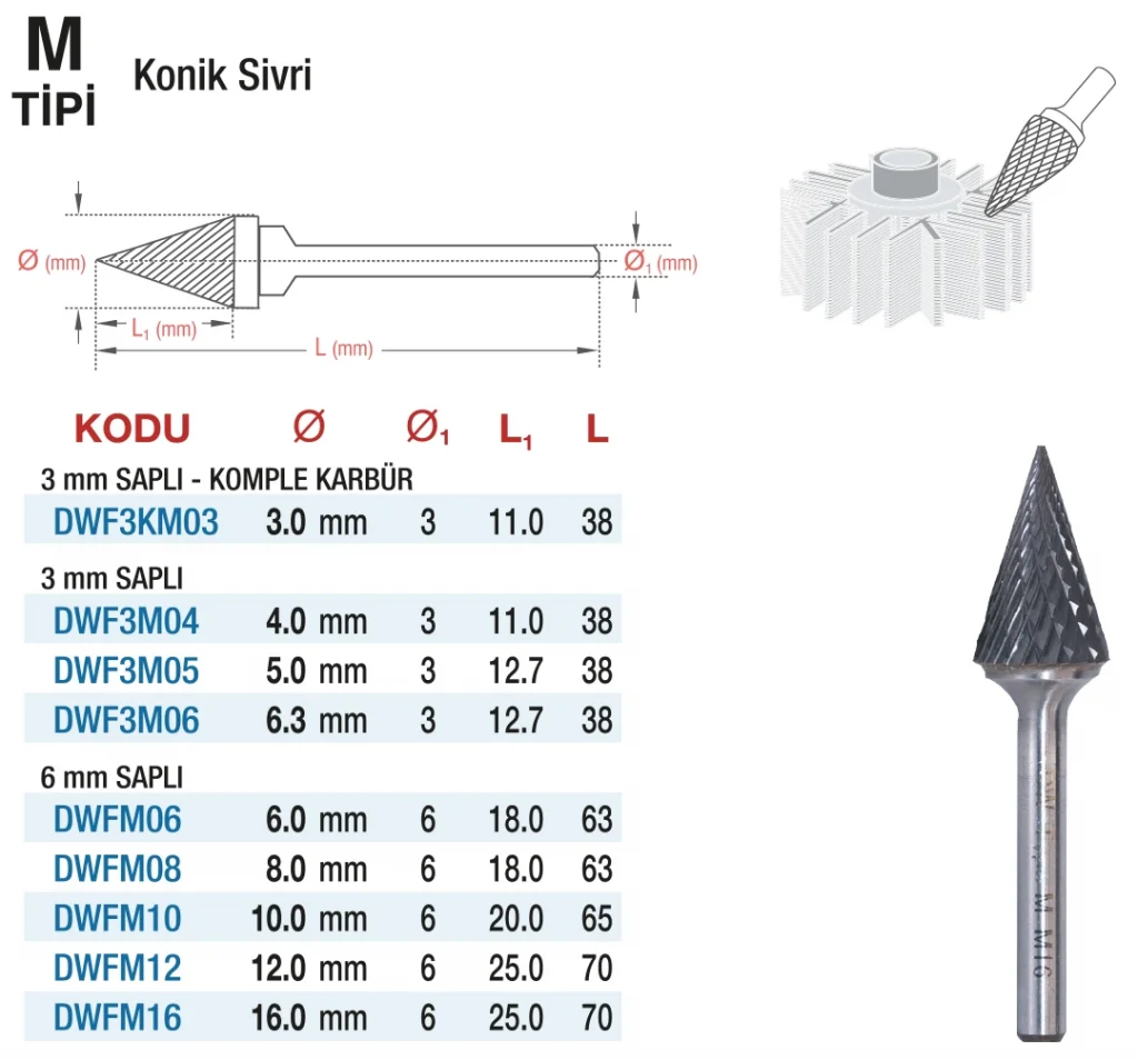 Tip: M Tipi konik ve sivri uçlu tasarımı sayesinde zor ve dar bölgelerde mükemmel işleme performansı.