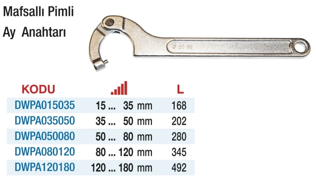 Pimli yapısı, anahtarın vida veya somuna tam oturmasını sağlar, böylece kullanıcıya güvenli bir tutuş ve yüksek tork gücü sunar. Bu özellik, özellikle ağır sanayi makinelerinin bakım ve onarım işlemleri için idealdir. D&W Pimli Ay Anahtarları, farklı boyut seçenekleri ile her türlü endüstriyel uygulamaya uygun olup, işlerinizi daha verimli hale getirir.