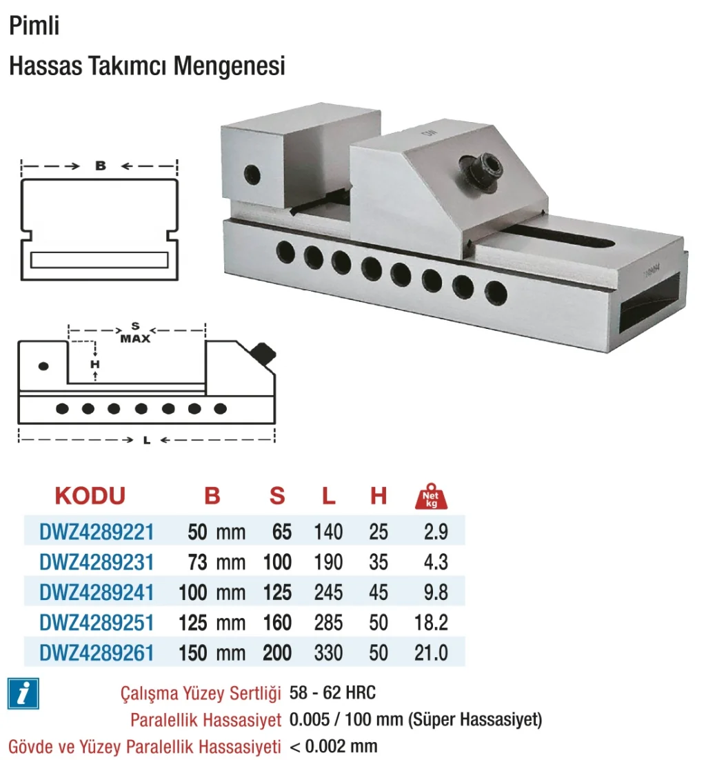 D&W Pimli - Hassas Takımcı Mengeneleri, işleme süreçlerinde iş parçalarının hızlı ve güvenli şekilde sabitlenmesi için geliştirilmiş profesyonel mengene modelidir. Pimli sıkma mekanizması, iş parçalarının kolayca konumlandırılmasını ve sıkıca tutulmasını sağlarken, yüksek hassasiyet ve iş güvenliği sunar.